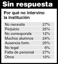 En otros casos se reconoce la situación, pero se aducen numerosas dificultades que impiden una posición activa. “Sostienen que no les corresponde intervenir: algunos incluso dicen que no es legal, lo cual es falso. Y están los que explican que no pueden hacerlo: porque tienen muchos alumnos, porque no están formados. A veces invitan a los padres a llevarlo a otra escuela.”
