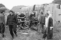 Dos muertos, 27 heridos, y la inauguración oficial de la temporada turística postergada por duelo en Tucumán: tal fue el resultado del vuelco de un micro, sobre el pavimento mojado de la Ruta 9, a 30 kilómetros de San Miguel. No fue el único accidente grave de ayer: en un paso a nivel sin barreras de la localidad bonaerense de Marcos Paz, un tren arrolló un auto donde viajaban un matrimonio, su hija y un joven: los cuatro están muertos.