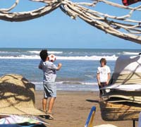 Los más activos, se sabe, son los chiquitos. Para ellos se organizan maratones, carreras de perros y la posibilidad, como la tuvieron este verano, de aprender algunos secretos del rugby o del hockey y de tener contacto directo con estrellas del nivel de Agustín Pichot, de Los Pumas, o Magdalena Aicega, de Las Leonas. Una de las características de Pinamar es que en sus playas no hay prácticamente sombrillas. Todos los que van alquilan carpas. Esto hace posible que haya mucho más espacio, por ejemplo, para jugar al deporte más popular: el fútbol. Tal vez por la presencia cercana de estrellas del deporte, Maribel (33 años) no quiso ser menos y demostró sobre la arena que podría prenderse en cualquier picado con cualquier hombre que se precie de jugar bien al fútbol. Para romper ciertos mitos, ella era la encargada de enseñarle a jugar a su hijo Martín, que la seguía con el interés del que está ante una maestra en serio. A mamá sólo le pudo robar alguna sonrisa y muchos besos. La dueña de la pelota era ella, con su pie zurdo o con el diestro. En el área, buscando el gol, debe de ser temible.