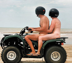 Es una pareja mayor que llega, en cuatriciclo, hasta el margen sur de la playa nudista. Vienen vestidos, pero antes de cruzar el “muro” de 1,60 metro –construido con ramas y hojas de álamo– que separa a los “textiles” de los nudistas, deciden cambiar de equipo y se quitan la ropa, pero conservan puestos los cascos. La seguridad es importante. Vuelven a subir a la máquina que los lleva y se prestan para la foto. El hombre dice que viven en Olivos, en la zona norte del Gran Buenos Aires. Miriam y Tony, los anfitriones de la Playa Querandí, quedan encantados por el paso fugaz de la pareja, que sigue rumbo al centro de Gesell, luego de saludar con especial cortesía y de volver a vestirse.