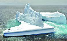 Un gigantesco iceberg, entre las costas de Australia y Nueva Zelanda, se está dividiendo en centenares de partes (una de ellas, enorme, en la foto) a medida que deriva hacia el norte. El iceberg, bautizado B17B, de una superficie inicial de 140 km2, fue localizado el 9 de diciembre, derivando a 1700 km al sudoeste de Australia. Desde esa fecha redujo su tamaño, aunque aún mide 115 km2, es decir, el doble de la superficie del barrio de Manhattan, en Nueva York. El inmenso témpano, contra la regla de su especie, tiene una base reducida por la temperatura del agua.