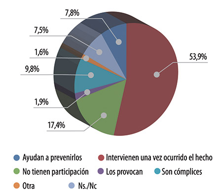 La escasa confiabilidad hacia las fuerzas de seguridad –que se manifiesta, por ejemplo, en que ninguna de las denuncias por violencia de género se realizó en una comisaría de la mujer (ver nota principal)– puede encontrar uno de sus motivos en los niveles de participación que los vecinos les adjudican ante hechos de violencia. El gráfico es claro. Sólo el 7,8 considera que ayudan a prevenirlos. En cambio, la mayoría (53,9) consideró que intervienen después de ocurrido el hecho con lo que no sirven como solución ya que, después, el seguimiento de los casos ocurridos también fue considerado bajo. El 17,4 sostiene que no tienen participación con lo que funcionan con una neutralidad que aporta a la violencia. Para colmo, el 1,9 considera que las fuerzas de seguridad no sólo no solucionan el problema sino que lo provocan. Y mucho más grave aún por el hecho y por la dimensión, el 9,8 sostiene que son cómplices del delito o la violencia, categoría que ocupa nada menos que el tercer lugar. La faz negativa de la participación de las fuerzas de seguridad suma un 83 por ciento.