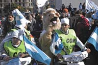 Cuando la policía atinó a cortar el tránsito, un grupito de hinchas ya había ganado la altura de la verja que rodea el Obelisco y desde allí, no eran más de quince, conducían el ritmo de los cantitos, que invariablemente abrevaban en el ya acostumbrado “volveremos, volveremos...”. Sobre la plazoleta, de Corrientes hacia el norte, ya había casi 3000 personas y no hacía siquiera 45 minutos (un tiempo, medido con el reloj futbolero) que el italiano Rossetti había pitado el final perdonándoles el descuento a los pobres serbios. Un grupo grande fabricaba el pogo para una cámara de TV esquivando dos o tres puestitos de venta de camisetas y cornetas hábilmente surgidos entre la multitud de caras pintarrajeadas de celeste y blanco. Arranca el coro a cantar: “Señores, dejo todo / me voy a ver a... “ Se produce un silencio mínimo dónde normalmente va el nombre del equipo favorito, y sigue el cántico: “Porque los jugadores/ me van a demostrar...”. Crece el sordo rumor de las cornetas, la gente se saca fotos con sus celulares, se perciben unas ganas fenomenales de subirse al carro de la alegría. No duró mucho: a primera hora de la tarde se despidieron prometiéndose volver a juntarse el miércoles...