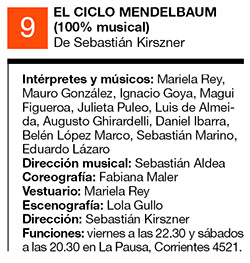Estrenada recientemente en (La Pausa) Teatral, espacio que el director inauguró el año pasado, la obra es algo así como la que en ese museo se exhibiría en lo más alto y con marco extra dorado, escoltando a las demás. No es que sea “mejor” que las anteriores sino que de algún modo las contiene, haciendo una síntesis perfecta de sus colores, sus temas y sus procedimientos. El ciclo Mendelbaum es, como reza el subtítulo, “100% musical”, algo con lo que Kirszner coqueteaba desde siempre (una de sus anteriores piezas era “casi un musical”). Y lo es no sólo en el aspecto formal (el de tener un director musical, composiciones y coreografías y una organicidad y coherencia entre texto hablado y cantado) sino también en uno más simbólico. Porque todo en la obra funciona como una partitura: todo tiene un tiempo justo y un lugar preciso.