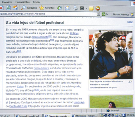 Para Taragüí, “Menem fue justamente célebre por sus boutades, y omitirlas es faltar a la completud del artículo (como sería omitir la kilométrica extensión de los discursos de Fidel Castro o los modales fríos y despectivos de Lionel Jospin). Hacen, por así decirlo, al personaje”. El usuario se refiere al texto biográfico que omite sus lecturas de Sócrates, sí referidas a través de enlaces con notas de Tomás Eloy Martínez y Alberto González Toro. La crisis del artículo de Maradona, en cambio, estalla cuando “se minimizan sus problemas con las drogas –critica el usuario Edub–, tanto que sólo hay una referencia a ella y cuando se pone que la efedrina es para la gripe con claras intenciones tendenciosas”. Gerkijel objeta como un fiscal: “No fue cedido a Boca Juniors sino que ese club compró sus derechos federativos/ el equipo que dirigió es Mandiyú y no Mandiyú de Corrientes, sino debería decirse –siguiendo ese ejemplo– Boca Juniors de La Boca en vez de Boca”.