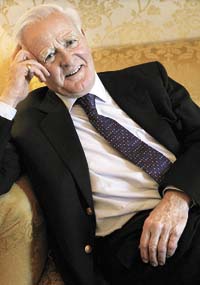 David John Moore Cornwell (Poole, Inglaterra, 1931) debió de ser un excelente espía antes de convertirse en el archifamoso autor del género bajo el pseudónimo de John Le Carré. Porque es de trato muy afable, cabeza patricia y escucha con británica atención tras sus ojos casi transparentes de azulgrisáceos que son. O sea, cualquiera se lo contaría todo.