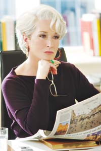 Vestida con unos modelitos llamados a despertar guaus en la platea, el cabello tan blanco como una Cruella DeVille de un solo color, capaz de destruir la carrera de un diseñador top con un simple fruncimiento de labios, Miranda Priestly es otra creación extraordinaria de Meryl Streep, quien según dicen se habría inspirado en la editora de Vogue. Miranda es la flor y nata de la película, y todo lo que tiene que ver con ella –gestos y miradas fulmíneas, aires de reina y cortantes epigramas– es enormemente disfrutable. El problema es que, a pesar de todo ello, Miranda no deja de ser un secundario, con su secretaria, Emily (la inglesa Emily Blunt, consagrada en Mi verano de amor) y Nigel haciéndole un adecuado coro de venenos. Mucho menos interés tiene la muy normal Andrea y todo aquello que la rodea: novio, familia, círculo de amigos y nuevo candidato. Como es a ella a quien la película sigue, el interés va decayendo, de modo tan implacable como Miranda Priestly, cada vez que juzga alguna nueva colección.