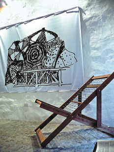 El crítico Bengt Oldenburg escribe para esta exposición: “Ahora no hay pinturas y los dibujos son, en realidad, proyecciones, escaneadas y pasadas por un plotter, intermediarios técnicos que agrandan los trazos originales y les confieren una calidad gráfica que los asemeja a una escritura o a una partitura musical. La visión casi panorámica de este paisaje de playa hace pensar en los montajes de grandes telas de hace un siglo, inmensas telas pintadas que abarcan hasta 360 grados, ambulantes pero efímeras, concebidas como un espectáculo para el gran público. Uno de los recursos de entonces consistía en colocar objetos reales delante de las pinturas para reforzar la ilusión de perspectiva y de realismo. Esto también ocurre aquí e incluso hay una silla de playa que, en vez de loneta, es de alambre de púa, referencia inquietante (foto). Pero lo que en muestras anteriores fue pintura ahora es el resultado de una intervención tecnológica y la textura es la de un estampado. Tal vez Fazzolari piensa en la obra de arte en la era de su reproducción mecánica, obra sustraída de su condición de objeto para devenir la expresión de un concepto.