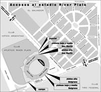 - El ingreso al campo será por Udaondo, por el portón Local de River. La cola será por la vereda de Tiro Federal hacia Libertador. Para entrar a la Platea Baja y Alta Belgrano y Palcos Privados Belgrano habrá que ir a las puertas de Udaondo y hacer cola por la vereda de River hacia Libertador. Quienes tengan entradas para Popular, Platea Alta y Baja San Martín, y palcos privados San Martín, irán desde Monroe hacia la puerta principal del club sobre Figueroa Alcorta.
