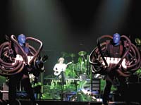 Los socios fundadores de Blue Man Group son tres neoyorquinos, Chris Wink, Matt Goldman y Phil Stanton. En su página web, el grupo pone en palabras su objetivo: “Transmitir sensaciones visuales y sonoras de un modo completamente nuevo”. En esta “experiencia multimediática”, donde interviene la actuación, el mimo y la comedia, la música tiene un lugar destacado, con una banda de siete instrumentistas que se suma a los tres blue men. Además de los instrumentos convencionales, incluyen recursos más exóticos como el cimbalón (un antiguo instrumento de cuerdas húngaro) y otros de producción propia con combinaciones de caños y tubos de PVC, de distintas formas y tamaños. La atmósfera sonora general tiene que ver con la música electrónica, la percusión y, en el caso de su último show, con cierta estética estelar americana, marcada por himnos como “Born in the USA”, de Bruce Springsteen.