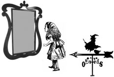 Si Alicia estuviera de lado, con el brazo derecho señalando hacia el espejo, ella y su imagen estarían cabeza arriba. Ella y su imagen mirarían hacia el Oeste. Pero su brazo señalaría hacia el Norte, mientras que el de la imagen señalaría hacia el Sur.