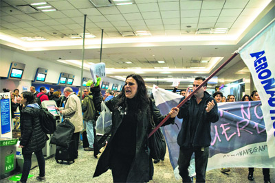 Foto: Constanza NiscovolosLa verdad, no se le movió un pelo a la mayoría de las personas que estaban en el hall central de Aeroparque el miércoles pasado a la 1 de la tarde, cuando frente a su vista comenzaba a latir el ruidazo por el paro internacional de mujeres. Sólo algunas personas acompañaron con la mirada y con sus palmas, desde la mesa de un bar o la cola del check-in, el eco del “Ni-una-menos/Vivas-nos-que-remos” que gritaban las 50 mujeres vestidas de negro que avanzaban contundentes. Empleadas de tierra de líneas aéreas y del free shop, azafatas sin uniforme ni maquillaje dejaron sus puestos para repartir cintas negras y folletos mientras afirmaban: “No más femicidios”, “No criar niños machistas”, “Es un día de duelo, nada que festejar”. La misma acción se replicó en Ezeiza; los volantes viajaron a los mostradores de todo el país. Después, almorzaron juntas y salieron a la calle para unirse a la marcha, encolumnadas con la CGT y la CTA, según la adherencia de sus gremios.