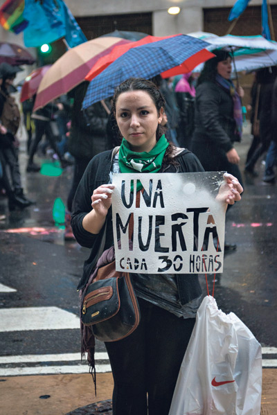 En San Juan era de un grupo que se llama Las Hilarias Feministas aborteras de Socorristas en Red y en Buenos Aires estoy en un grupo que se llama Las Furias y acompañamos a mujeres que quieren interrumpir un embarazo. Yo soy de San Juan, pero me tuve que venir a vivir a Capital porque la minera nos contamina todo y no tenemos laburo. En San Juan los empleos tienen que ver con la minera y son para varones. Cada tanto te ponen a una mujer manejando un camión, pero la mayoría de las mujeres no tenemos trabajo. El desempleo es terrible. Las egresadas de la Universidad de San Juan nos vivimos a Buenos Aires y tenemos triple opresión. Nos pagan menos y no conseguimos los mismos puestos de trabajo que los varones.