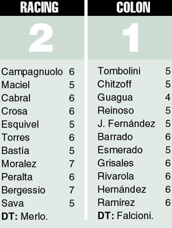 Nadie se anima a proponer a Racing como uno de los candidatos al título. Es cierto, el fútbol que despliega en cada una de sus presentaciones no augura un futuro tan auspicioso. Pero, ajeno a cualquier ilusión, el conjunto dirigido por Reinaldo Merlo parece haberse aferrado a la senda de los buenos resultados y sumó su tercera victoria consecutiva. En un partido entretenido, Racing venció 2-1 a Colón, con goles de Moralez y Bergessio, y ya está a cinco puntos de Boca. El equipo santafesino, por su parte, pagó caro su falta de contundencia, sufrió su sexta derrota en el torneo y quedó en las puertas de la zona de Promoción.