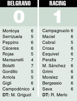 En el arranque del complemento, Racing debió convivir con la ausencia de Moralez. El volante creativo, quien hasta ahí comandaba el ataque del visitante, se retiró lesionado y, automáticamente, el conjunto de Merlo se refugió en su área. Griguol, por su parte, apostó sus fichas en los ingresos de Frangipane, Soriano y Aimar. Con ellos, Belgrano ganó en precisión y comenzó a desequilibrar a los volantes de contención. En ese momento, Racing sentía las ausencias de Bastía y Torres, ambos suspendidos por acumular cinco tarjetas amarillas. Pero las buenas intenciones generadas por el local chocaron una y otra vez contra una sólida defensa, liderada por Crosa. Pese a la poca eficacia, el equipo cordobés protagonizó una clara situación: Gigli, sin marca, estrelló un cabezazo en el travesaño ante la mirada de Campagnuolo. Soriano y Arriola tampoco pudieron quebrar la resistencia del arquero, quien contuvo sus respectivos remates con mucha seguridad. Allá va Racing: sumó su cuarta victoria consecutiva y el próximo fin de semana recibe a Boca en su estadio.