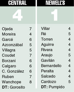 Minutos antes del encuentro, Nery Pumpido especuló con la confirmación de la alineación de Newell’s y hasta llegó a sugerir la presencia de tres delanteros en cancha (hizo precalentar a Héctor Steinert a la vista de los periodistas) para sorprender a su par de Central. Y seguro que dejó incrédulo a Néstor Gorosito. Porque la planilla oficial que firmó el técnico tenía a los dos goleadores paraguayos más la presencia de 7 (sí, siete) defensores. Gorosito jugó su partido recién cuando Horacio Elizondo se llevó por primera vez el pito a la boca. Porque Central fue en busca de la victoria con decisión y prescindiendo de los desbordes tácticos que acusan quienes entienden el fútbol a partir del invicto de su arco propio. Y el saldo fue curioso: en un clásico donde lo que prevalece en las estadísticas es el empate, el que hizo voto por satisfacer la tendencia de los números sufrió cuatro goles y dos expulsados.