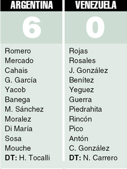 Muy rápido quedó en claro que el equipo de Tocalli quería dejar de lado la pobre imagen que había mostrado hasta el momento en el certamen. Desde el esquema ofensivo que esta vez planteó el entrenador, con dos delanteros rápidos como Mouche y Sosa y dos conductores hábiles como Moralez y Di María, hasta la actitud de los pibes, de ir a buscar el triunfo desde el primer minuto. Por eso, no extrañó que Argentina se llevara por delante a Venezuela y comenzara a acomodar el desarrollo a su favor. Es que la defensa venezolana apenas si podía contener la voracidad mostrada por los chicos albicelestes.
