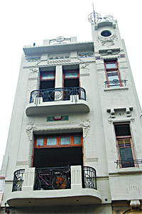 con puertas, vidrios y hasta celosías de madera curvas. Alguna vez, en su debut, el hotel tuvo interiores elegantes. Lo único más o menos intacto es el hall de entrada que aloja la escalera que sube directamente de la calle, con sus molduras pintadas ¡al esmalte! El espacio de la escalera está iluminado en cada piso por unas muy bonitas rejas con vidrios coloreados, ya recuperadas, y las habitaciones tienen todas sus puertas de madera, ya libres del pegote de pintura. Se destacan dos sistemas, uno el de los ambientes nobles del frente, muy Art Nouveau y con vidrieras de colores, y los de la primera habitación hacia atrás, de maderas, vidrios y hasta celosías curvas, una verdadera rareza que fue recuperada con esmero.