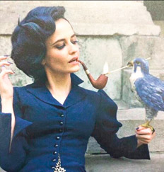 EVA GREENEva Green, que ya había trabajado con Burton en Sombras tenebrosas de 2012, es francesa, tiene 36 años y en 2006 fue Vesper Lynd, la trágica chica Bond de Casino Royale, la que muere enamorada del 007 y lo deja transtornado. “Muero mucho en las películas y me dan papeles muy oscuros”, dijo ella en una entrevista reciente. Y después, con su sonrisa de dientes voraces y su extraordinaria gracia agregó: “No sé por qué”. Fue Morgan en la fea serie Camelot de 2011: nada funcionaba pero a ella el personaje de la antagonista mágica del rey Arturo le quedaba genial. Mucho mejor era su papel de Miss G. en Cracks (2009), una película con lejanos ecos a Miss Peregrine donde era la atractiva profesora de natación en un internado para chicas británico, una joven instructora fascinante que se obsesionaba sexualmente con una alumna española y desataba todo tipo de crueldades: la película pasó algo desapercibida aunque tiene un aire a Criaturas celestiales, esos amores femeninos tóxicos y abigarrados. Fue una predecible pero efectiva mujer fatal en Sin City 2 (prohibieron por demasiado hot el póster de la película que la tenía como protagonista) y la atrevida enamorada de la muerte Artemisia en 300: Rise of The Empire, la mediocre secuela de 300 de Zack Snyder. Pero el personaje que la encontró en su mejor momento, que la envolvió y la devolvió al juego sacándola de secuelas y películas olvidables fue Vanessa Ives en la serie de Showtime Penny Dreadful (2014-2016), una bestial fantasía gore victoriana protagonizada por médiums, Frankenstein, Dorian Gray, Drácula y Mina Harker, el Dr. Jeckyll y toda la fauna egiptóloga y ocultista del Londres decimonónico literario y sensacional. Ahí Eva Green es medium y trajinadora de otros mundos, vestida de negro, sexy y monacal, asaltada por espíritus, huésped físico de un demonio milenario: trabaja para el bien y enamora pero su vida es puro tormento. La serie terminó después de tres intensas temporadas: la liberó, la posicionó y le dejó el terreno para ser la diva que quiera ser. “Cuando me encasillan como ‘misteriosa’”, dice ella, “supongo que es porque tengo pelo oscuro y soy francesa. Pero es verdad que soy un poco descastada, a mi manera. Siempre me sentí distante de los demás. Como si flotara. Me gustaría ser más terrenal.” Esa cualidad, etérea pero densa, la llevó a interpretar tantas hechiceras. Y ahora a esta institutriz vestida de negro que puede metamorfosear en halcón, otra irresistible bruja de ojos azules.