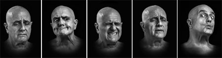 Este es el resumen de la última muestra de Roberto Jacoby, Fotos 2016, en la flamante sede microcéntrica del Nuevo Museo Energía de Arte Contemporáneo (La Ene). La primera sala incluye fotografías impresas en papel, en blanco y negro muy contrastado, en las que el rostro de Jacoby en primer plano luce atrofiado por la tristeza, saturado de una especie de abulia, mirando la nada o mirando para abajo como si acabara de leer una pésima noticia. En la segunda sala, las fotos formalmente idénticas caen en una estampida de muecas de ira, desafío y ansiedad. Las fotos miran sin mirar: el espectador puede sentirse observado, pero Jacoby parece mirar para otro lado, reaccionar a algo que le produce desasosiego, pereza, furia. La muestra es un catálogo de las emociones... ¿un catálogo de las emociones?