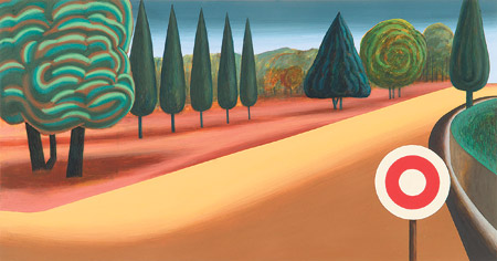 Si en muestras anteriores las figuras humanas de sus pinturas (convertidas en figuras geométricas que llevaron siempre a pensar en seres post humanos o robots), en Detrás del Paisaje lo que queda de ellas es solo sus pelucas cinéticas. De Monte: “En mis muestras anteriores siempre hubo un personaje que quizá con el tiempo fue cambiando un poco pero siempre fue reconocible. Acá solo quedó la peluca del personaje. Siempre me gustó que convivan distintos discursos dentro de las pinturas y que haya una mezcla de registros, algo que también me atrae en la música. Y estas pelucas tienen un contenido geométrico y cinético: es una línea que tiene un movimiento virtual”. Profesor de artes visuales especializado en grabado en el IUNA, De Monte ha logrado desarrollar una obra inconfundible, que en gran medida se basa en sus métodos artísticos: “Todas mis pinturas tienen un proceso muy artesanal: mi viejo pintaba igual, aunque él trabajaba en general con fotos de paisajes en la ciudad universitaria de Córdoba. Yo nací acá, pero tengo a toda mi familia allá. Mi mamá también era pintora, y quizá por haber crecido en ese ambiente al principio me interesaba estudiar algo más científico y me metí a estudiar Agronomía”. Apenas un par de años después De Monte se decidió a empezar a estudiar pintura en serio: “Entré a la escuela de arte y también trabajaba en el taller de mi viejo ayudándolo. De ahí me quedó ese método, que es muy mental también y quizá por eso a veces reniego un poco: la verdad es que me gustaría hacer expresionismo abstracto, pero no me sale”. Así como también acepta cierta influencia de pintores argentinos clásicos como Spilimbergo, Seguí (amigo de su padre), Aizenberg y contemporáneos como Carlos Bissolino o su alumno Víctor Cunsulo en sus obras actuales, De Monte recuerda que, aproximadamente en 1984 vio una muestra de Diulio Pierri en el C.C.Recoleta que, literalmente, le voló la peluca: “Eran unas obras gigantescas, de 5 o 6 metros, en plena época de la transvanguardia italiana, pleno retorno de la pintura. La vi y me dije: ‘Yo quiero hacer esto’. Y ahí me puse a pintar, porque hasta entonces me interesaba más la gráfica y me había especializado en el grabado. Siempre me interesó lo que yo no sé hacer, y esas pinturas abstractas a lo mejor el artista las hace en un par de días, pero probé de hacer eso y no me salió. Yo construyo mis imágenes de una forma más mental, más fría. Pero fue un gran estímulo y empecé a trabajar de a poco con la geometría: mi forma de armar un cuadro es muy diferente. Para armar un cuadro armo un diseño, un dibujo. Trabajo un poco como los que hacían las historietas antes: voy poniendo papeles calcos hasta que encuentro donde voy a poner la peluca, hasta que veo dónde funciona cada elemento y ahí después hago una cuadrícula, incluso a veces dejo algunos restos que se ven de cuando paso del diseño al bastidor. Después el proceso de pintarlo es más libre porque lo elijo ya en el momento. Estas señales (dice mientras señala unos discos de círculos concéntricos que parecen calcomanías pero que están pintadas) también me vienen de mi viejo, él también las metía en sus paisajes. Es un recurso pictórico, un llamado tímbrico, algo que también tomé de mi papá, que él a su vez quizá tomó de David Hockney. Es toda una cadena: nosotros vivimos en un mundo de imágenes y parece que a uno se le ocurren, pero creo que lo que uno hace es más bien conectar cosas que uno ya tiene internalizadas.”