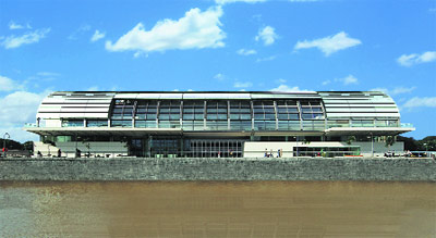 EL ESPECTACULAR EDIFICIO DEL MUSEO EN PUERTO MADERO, DISEÑADO POR RAFAEL VIÑOLY, CON UN TECHO ABOVEDADO DE VIDRIO Y METAL QUE ASPIRA A GARANTIZAR LA MAYOR LUZ