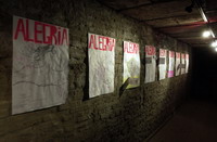 Juan Barbieratti nació en Colón, Provincia de Buenos Aires, en 1979. Estudia y enseñó en la Escuela de Bellas Artes de la UNR, donde fue ayudante en la Cátedra de Dibujo II de Susana Paladini, quien contribuyó enormemente a plasmar su forma de pensar el dibujo, según cuenta el joven artista a Rosario/12. Habla además de una serie de dibujos inéditos iniciales donde empleó materiales escolares, no específicamente artísticos, en un intento de abordar críticamente el fenómeno de la educación. "El lápiz duro, aquel que uno usaba en la escuela", subraya. Comunes y corrientes, tales materiales son un hilo conductor que atraviesa aquella muestra de mayo y la presente: es un concepto muy en sintonía con la actual tendencia del arte contemporáneo a reducir la diferencia entre el objeto artístico y el objeto no artístico a una diferencia invisible, puramente filosófica. Estos diez dibujos están coronados por un tosco stencil rosa fluo que los atraviesa como un titular al grito de ALEGRIA.