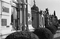 La difusa materialidad de las tumbas me marea, angelitos de yeso, obras maestras de Lucio Fontana, estatuaria venida de Siena, de Lombardía, de Florencia y siempre de Génova; epitafios poliglóticos: a nuestro querido padre, ses enfants; teledirigidas: in the beloved memory of John Foster Connors, who died in Rosario in 1920 at the age of 19, recitadas por telégrafo a la oficina de arte funerario ubicada en un lugar.remoto llamado Rosario, como la heroína de Rostros Olvidados, película que años después (pero ya hace muchos años de esto) haría Libertad Lamarque.