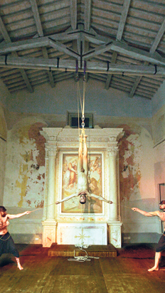 –Mi cuerpo había estado ausente de mi obra desde el año 97. Ahora retorno al uso de mi cuerpo porque la acción que hice para la performance (hoy, un video) “Mundo invertido” requería algo bastante transgresor; pensé que era una buena oportunidad para volver a conectarme con el uso de mi cuerpo. Primero porque la exhibición tiene un alto contenido autobiográfico, o de deseo de autorrepresentación en relación a la forma como estas historias teológicas han sido impuestas en mi cuerpo específicamente. Y también porque no solamente hay una reflexión teológica sino también erótica y sexual. Me interesaba unirlos y el lugar en el que ya están unidos de por sí es mi cuerpo.