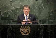 El presidente de Colombia, Juan Manuel Santos, agradeció en la ONU el respaldo de la comunidad internacional al proceso de paz con la guerrilla de las FARC y celebró: "Después de más de medio siglo de conflicto armado interno, regreso a las Naciones Unidas, en el Día Internacional de la Paz, para anunciar, con toda la fuerza de mi voz y de mi corazón, que la guerra en Colombia ha terminado".