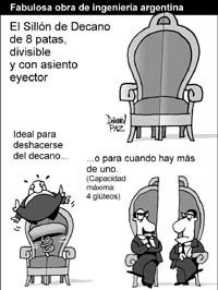 Apenas había empezado la reunión irrumpieron por la fuerza unos cuantos alumnos de Ingeniería, apoyados por la Federación Universitaria de Buenos Aires (FUBA). “El consejo es una farsa”, gritaban. “Esta sesión entra en cuarto intermedio”, se apuró a decir el rector Guillermo Jaim Etcheverry y ya la sala estaba ocupada: “Ay, ay, ay, qué risa que me da, por un decano trucho no se puede sesionar”. “Pedimos que Rosito no se siente en el consejo hasta que no se resuelva la situación de Ingeniería –comentó a este diario la consejera estudiantil Laura Kniznik–. Ni siquiera pedimos que se siente Cernuschi, sino que lo haga el vicedecano.” Es que el gobierno de la UBA todavía no resolvió si fueron válidas la remoción de Cernuschi, ocurrida el mes pasado, y, en consecuencia, la elección de Rosito como decano de Ingeniería. Con dictámenes jurídicos contradictorios, la cuestión todavía debe discutirse en la Comisión de Interpretación y Reglamento.