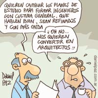 ¿Cuáles serían los cambios respecto del Libro Azul? “En general, se pretende acordar una fuerte formación básica, que incluya matemática, física, química, también una fuerte formación en tecnología y un pantallazo al conocimiento de las aplicaciones, que se vuelven obsoletas en pocos años. La formación básica debería servirle al ingeniero para poder adaptarse a esas modificaciones y actualizarse permanentemente.” Además de la incorporación de nuevos desarrollos y tecnologías, un cambio radicaría en la suma de “una formación integral, no sólo técnica sino que incluya también cultura general, comprensión y expresión oral y escrita, para mejorar la formación integral de los ingenieros”, comentó Morano, que en el último plenario del Confedi fue sucedido por Enrique Arnau (Jujuy). Si bien el debate entre las facultades recién comienza, parece haber acuerdo respecto de la duración de las carreras: seguiría siendo de cinco años, a diferencia de la tendencia europea hacia el grado de tres años y el posgrado de dos. “En Argentina no estamos en condiciones sociales de que los últimos años de estudios sean arancelados.” El Confedi aspira a que el grado de cinco años argentino sea equivalente al master europeo.