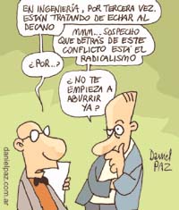 En diálogo con Página/12, el decano Cernuschi Frías consideró que la avanzada en su contra “es otro intento desesperado para impedir la normalización y democratización del claustro de profesores. Durante la gestión de Raffo (Carlos, anterior decano y actual secretario de investigación), no se concursaron 250 cargos y sólo se concursaba cuando estaban de por medio los amigos. De ese modo controlaban el padrón de profesores. Por eso no aceptan la nueva política de concursos que está desarrollando el rector Guillermo Jaim Etcheverry. Yo no quiero acomodar a nadie: que en los concursos ganen los mejores y el año que viene ellos podrán elegir a las nuevas autoridades”.