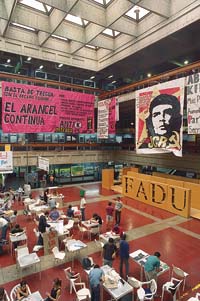 - Luces. De traje, acodados sobre las mesas de un taller, estudiantes de la Facultad de Arquitectura trabajan en la antigua sede de Perú 272. Circa 1960 –dice el epígrafe– y los techos del taller, de revoques roídos y despintados, recuerdan o pronostican las carencias presupuestarias y edilicias de la UBA versión siglo XXI. El aula es oscura, poca luz, las ventanas son mínimas y niegan la vista al exterior. ¿Universidad de elite, universidad encerrada? Una foto inmediata, tomada el año pasado por De Zuviría, propone la antítesis: un enorme ventanal de la sede actual de Arquitectura ilumina y comunica las maquetas blancas de los estudiantes con los colores del afuera. Pero hace falta otra imagen de Stern para completar la historia, su germen: armazones y materiales de construcción prueban que hace 45 años se empezaba a construir la Ciudad Universitaria, donde hoy luce aquel ventanal. La universidad de los ’60 proyectaba la universidad de hoy. ¿Qué proyecta la UBA presente? La única obra en construcción que muestra la muestra se dibuja como fondo de un retrato de Jaim Etcheverry, asomado al balcón del rectorado. Son los andamios desde los que se está reparando la fachada del edificio de Viamonte 440. La restauración de un pasado.