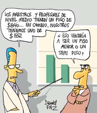 “Un mismo ministerio no puede tener una política discriminatoria y dual para los diferentes sectores docentes. Pedimos coherencia –dijo Pedro Sanllorenti (Mar del Plata), de Conadu–. Más allá de nuestras críticas a los adicionales en negro, el sueldo de un docente universitario es significativamente inferior al de un maestro, aun cuando requiere un título profesional y tareas diferenciales.” La relación entre cargos docentes indica hoy que el maestro de grado, las quince horas cátedra en la escuela media y las doce horas en un terciario tienen garantizado un sueldo de 840 pesos. Mientras, el equivalente cargo testigo universitario (ayudante de 1ª con dedicación semiexclusiva) percibe 552 pesos.