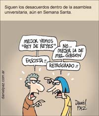 Las agrupaciones estudiantiles de izquierda se preguntan cómo bajarse ahora del conflicto que abordaron al forzar ya dos veces la suspensión de la elección. Pero las respuestas no son homogéneas. Hay una línea dura que, directamente, pretende disolver la asamblea universitaria. Otros sectores, en cambio, aceptarían que sesione la asamblea si la candidatura de Alterini es modificada y si las autoridades universitarias asumen el compromiso de reformar el estatuto. Esa diferencia interna se mantiene soterrada hasta ahora, para no debilitar la protesta y, también, para afrontar los cuestionamientos que arrecian desde el resto del movimiento estudiantil, del centroizquierda hacia el centro: no sólo de parte de las agrupaciones alineadas con la candidatura de Alterini, que quieren que sesione la asamblea, sino principalmente de las que le reclaman a la conducción de la FUBA que regularice la elección de autoridades, que se viene suspendiendo desde fines de 2004.
