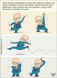 La postulación de Atilio Alterini sufrió una primera deserción que, por ahora, no alcanza a afectar su mayoría en una eventual asamblea. Los estudiantes de la Facultad de Medicina –parte del bloque mayoritario que integran radicales, peronistas y aliados de varias facultades– le pidieron al decano de Derecho “que retire su candidatura a rector” como un gesto para “terminar con el clima de violencia y ayudar a la gobernabilidad racional” de la UBA. Como había informado Página/12 el mes pasado, la postura yacía latente en Medicina y terminó de aflorar en la última semana, después de que el cuarto intento de elegir rector se viera frustrado por un violento enfrentamiento entre los estudiantes que protestaban y los sindicalistas no docentes que querían asamblea. Mientras, ante el final del mandato de Guillermo Jaim Etcheverry y la falta de un sucesor designado, la universidad quedó a cargo del vicerrector Berardo Dujovne hasta el próximo lunes (ver aparte).
