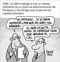 - Ineficiencia en el manejo de la playa de estacionamiento ubicada en Paraguay y Azcuénaga. A pesar de su ubicación estratégica y de su capacidad para 387 autos, los ingresos anuales sufrirían variaciones irregulares: 1,1 millón en 2001, 483 mil en 2002, 713 mil en 2003, 904 mil en 2004 y otra vez 1,1 el año pasado. Para el actual, se prevé un ingreso de 986 mil pesos, aun cuando medió un incremento del 25 por ciento del valor de la hora-auto (pasó de 2 a 2,5 pesos).