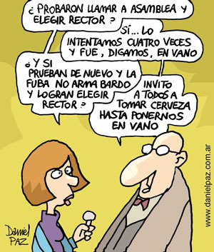 La FUBA mantiene su reclamo: democratizar la universidad antes de elegir autoridades. Si bien todavía no definió sus próximas acciones, ya anunció que mañana se manifestará en el Consejo Superior. “En principio, nos vamos a movilizar en solidaridad con el reclamo de los trabajadores de la sede Uriburu”, dijo Juan Pablo Rodríguez (PO), copresidente de la federación. Lo que la FUBA terminará de resolver hoy es su posición general frente al Consejo Superior: “Hasta ahora no nos estamos sentando en el consejo porque no reconocemos a Franco como vicerrector y exigimos su renuncia. Pero estamos analizando la situación. Creemos que la autoridades actuales no pueden llevar adelante las tareas pendientes en la universidad y podríamos presentar un proyecto para desenmascararlos”.