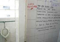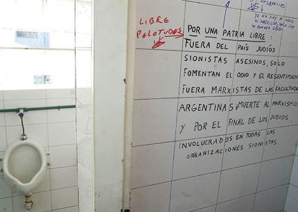 Otra diferencia con las inscripciones que hubo en Filosofía y Letras es que las pintadas aparecen sólo en los baños, no en las carteleras, aulas ni pasillos –en las que sí se expresan las agrupaciones con militancia concreta en la facultad–, lo que sugiere un fenómeno marginal. En el mismo sentido, la sistematicidad y la homogeneidad de estas expresiones (todas dicen lo mismo y fueron trazadas por la misma mano) parecen indicar un operativo único y puntual, que incluso podría haber realizado una sola persona. ¿Qué dicen las pintadas en Sociales? “Por una patria libre: fuera del país judíos sionistas asesinos, solo fomentan el odio y el resentimiento. Fuera marxistas de las facultades argentinas ¡¡muerte al marxismo!! Y por el final de los judíos involucrados en todas las organizaciones sionistas”, es una de las leyendas que se repite en los baños del primero, segundo y tercer piso.