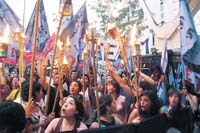 En contra de los planteos de la federación ayer hubo una manifestación estudiantil frente al rectorado, sobre Viamonte al 400. “Somos el pueblo y el carnaval, somos la UBA nacional y popular”, cantaban algunas de las 400 personas convocadas por agrupaciones de centroizquierda y kirchneristas de diferentes facultades, como La Vertiente, Colectivo para la Transformación Universitaria, La Mandrágora, QRS, Movimiento Evita, Movimiento Sur, IURE, Convocatoria, Megafón y otras. La concentración empezó alrededor de las 18.30. Una hora después encendieron antorchas y desplegaron una bandera negra con la leyenda “Defendamos la UBA”.