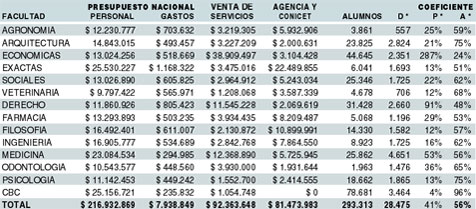En el cuadro adjunto se calculan algunos “índices” que ilustran la gravedad de la actual situación. Como puede verse, la distribución de los fondos “externos” entre las facultades es muy heterogénea, pues depende de la capacidad de cada una, según su “especialidad”, para por un lado vender servicios al sector privado y, por el otro, “captar” fondos de investigación provenientes de otras fuentes públicas y privadas. Pero vale insistir: el gobierno de la universidad sólo tiene potestad para administrar los recursos del presupuesto, mientras que los fondos restantes escapan casi por completo a su incumbencia y están en manos de los profesores, investigadores y autoridades que los obtienen directamente. En ese caso, las actividades se realizan en, desde y con la universidad; pero no es la universidad misma quien las hace, pues no tiene potestad sobre ellas.
