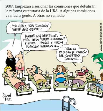 Mientras, en Ingeniería, el debate debía comenzar a girar en torno de los artículos del estatuto referidos al presupuesto, los recursos, el patrimonio y las inversiones. Pero no pudo ser: “Nos faltó un consejero. El quórum de las comisiones es complejo, es algo así como un tercio del total, pero además tiene que haber una presencia mínima por cada claustro. Necesitábamos 15 consejeros, pero llegaron 14 –lamentó Alberto Boveris, decano de Farmacia–. Por ahí los consejeros pensaron que el tema iba a resultar un poco aburrido”. O acaso no hay una voluntad mayoritaria de producir cambios en el área. Raro, porque pocos asuntos suelen ser más convocantes que los presupuestarios en la universidad. Ahora se espera que el rectorado vuelva a ponerle fecha de reunión a la comisión.