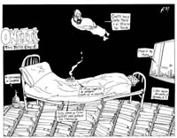 Juan Carlos Onetti, como casi todos saben, ha pasado gran parte de su vida en la cama. Allí leyó todos los libros que ha leído y también escribió todos los que hoy se venden en el mundo con su firma. Reclinado sobre el lado derecho, sosteniendo el infinito cigarrillo con la mano izquierda, llenó con la derecha cuartillas y cuartillas de letra clara y ligeramente cuadrada. “Se cumplió el sueño de tu vida. Pasar 24 horas en la cama”, le dije a modo de saludo. “No exageres, apenas 23”, dijo.