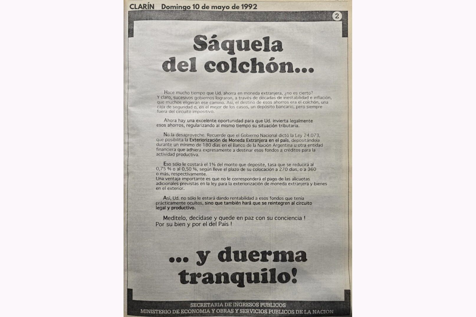 Sacar la plata del colchón: la metáfora de Caputo que ya había usado el menemismo